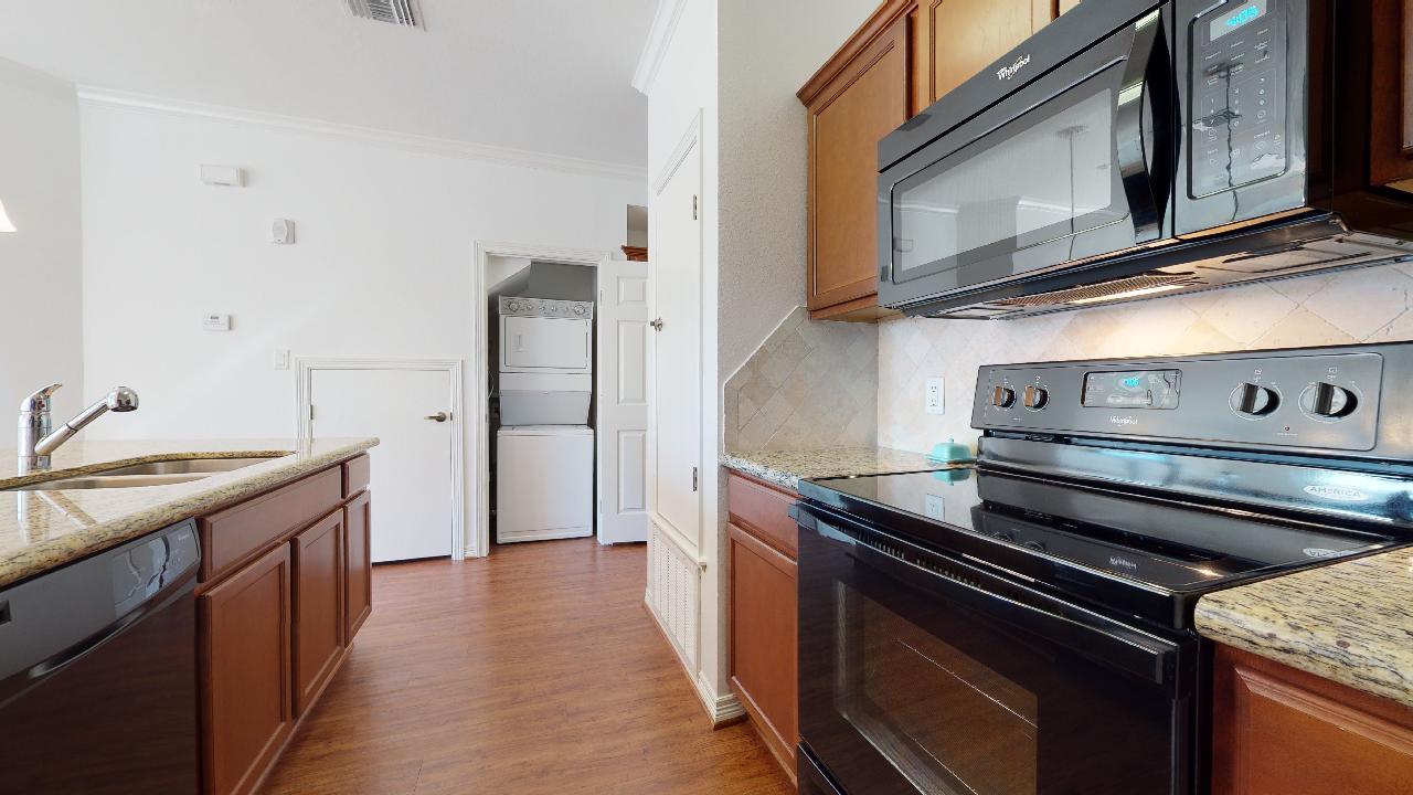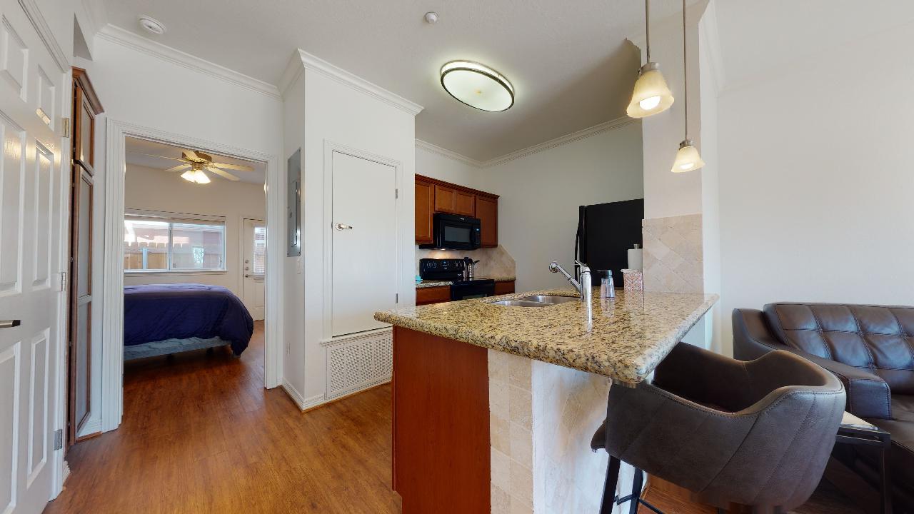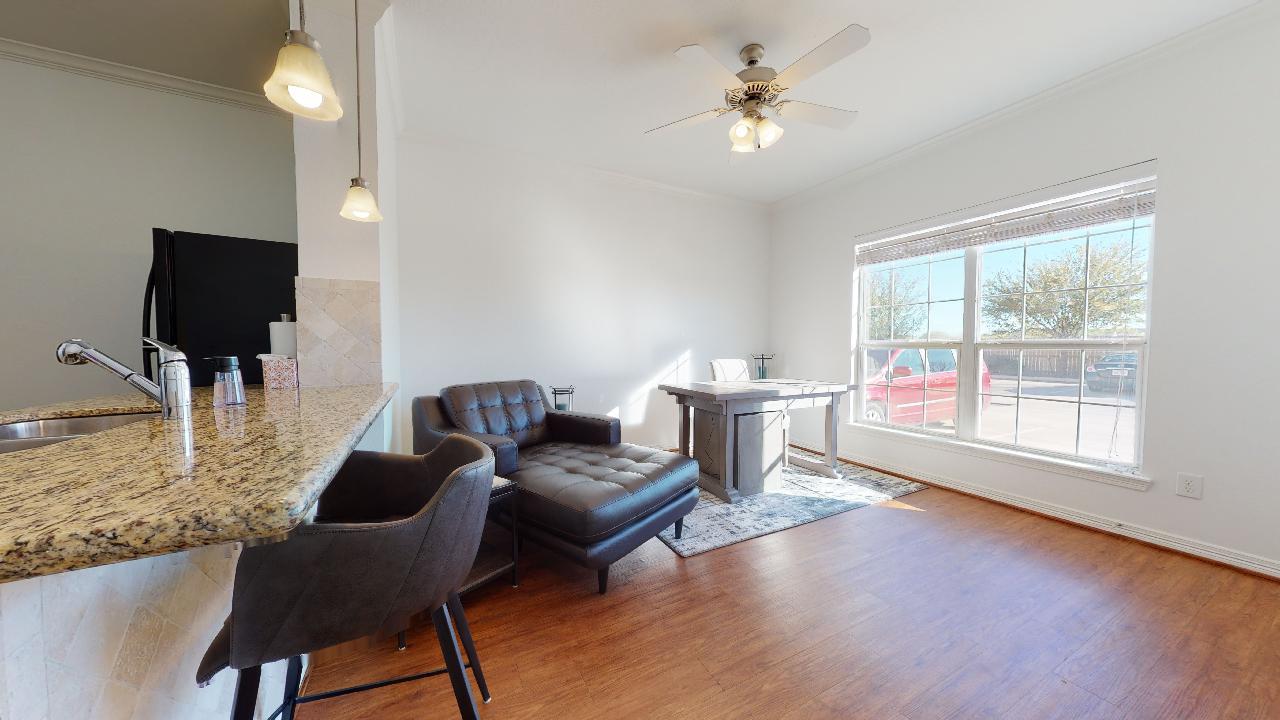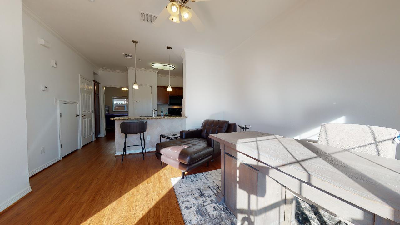 AVAILABLE FOR A JULY MOVE IN! Beautiful and spacious 1 bedroom, 1 bath condo located at Lakeridge Townhomes. Partially furnished with a Beautiful Leather Chaise lounge and Studious Desk in the Living room. Private Bedroom offers a Queen Bed, Dresser and night stand. Open concept with lots of natural light! Features wood flooring, granite counter tops, tile backsplash, breakfast bar, private patio area, & washer and dryer. The bedroom has a large walk in closet. Reserved parking. The Lakeridge townhome community has many wonderful amenities including a pool, hot tub, community common area for studying, a gym, tanning beds, and much more. On A&M bus route for quick access to campus. All leases participate in the Latchel Resident Benefit package. The additional fee for this package is $20 per month.